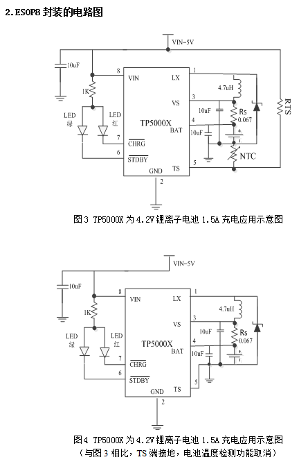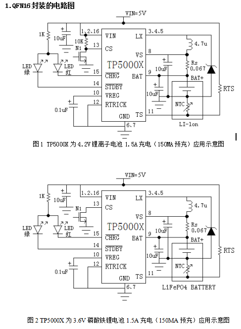 TP5000X具有宽输入电压,对电池充电分为涓流预充、恒流、恒压三个阶段,涓流预充电电流(QFN16)、恒流充电电流都通过外部电阻调整,最大充电电流达2A。TP5000X采用频率800kHz的开关工作模式使它可以使用较小的外围器件,并在大电流充电中仍保持较小的发热量。TP5000X内置功率PMOSFET、防倒灌电路,所以无需防倒灌肖特基二极管等外围保护。TP5000X的恒流功能(QFN16),也可以用在2串锂电池或4串干电池输入,恒流驱动0.5-7W白光LED。