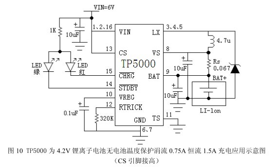 关工作模式使它可以使用较小的外围器件,并在大电流充电中仍保持较小的发热量。TP5000