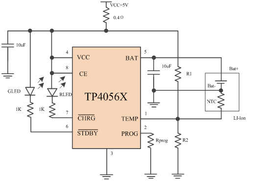 当输入电压(交流适配器或USB电源)被拿掉时,TP4056X自动进入一个低电流状态,将电池漏电流降至1uA以下。TP4056X在有电源时也可置于停机模式,以而将供电电流降至70uA。TP4056X的其他特点包括电源自适应、电池温度检测、欠压闭锁、自动再充电和两个用于指示充电、结束的LED状态引脚。