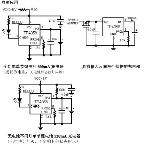 TP4058 是一款完整的单节锂离子电池充电器,带电池正负极反接保护反接,具有更大 600mA 的充电电流,更稳定的电流一致性。其采用恒定电流/恒定电压线性控制,SOT 封装与较少的外部元件数目使得 TP4058 成为便携式应用的理想选择。TP4058 可以适合 USB 电源和适配器电源工作。