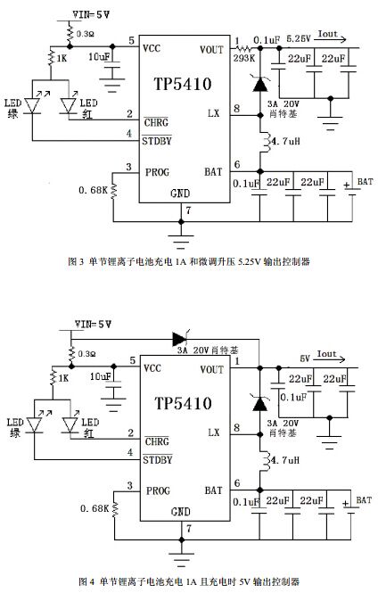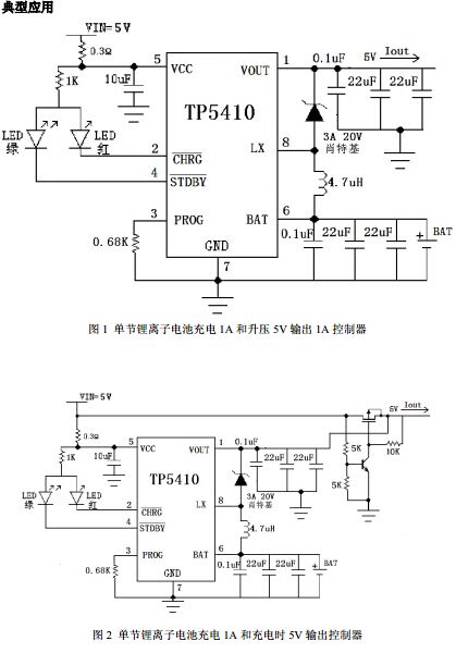 充电部分为线性降压方式,内置 PMOSFET,加上防倒灌电路,所以不需要外部检测电阻器和隔离二极管。热反馈可对充电电流进行自动调节,以便在大功率操作或高环境温度条件下对芯片温度加以限制,充满电压固定于 4.2V。充电电流可通过一个电阻器进行外部设置。当电池达到 4.2V 之后,充电电流逐渐下降至设定电流值 1/5,TP5410 将自动终止充电。升压部分同样内置了功率 NMOSFET,较小的内阻可以提供驱动能达到5V/1A。较高的集成度使得 TP5410 只需少量的外围器件即可正常工作。TP5410还集成了充电温度保护,升压输入电源限流环路,可根据负载情况动态调节电流,并具有快速响应和过流关断功能。升压转换器采用变频的方式,因此较国内外同类产品具有极低的空载功耗、纹波、更强的驱动能力,以及更高的效率。